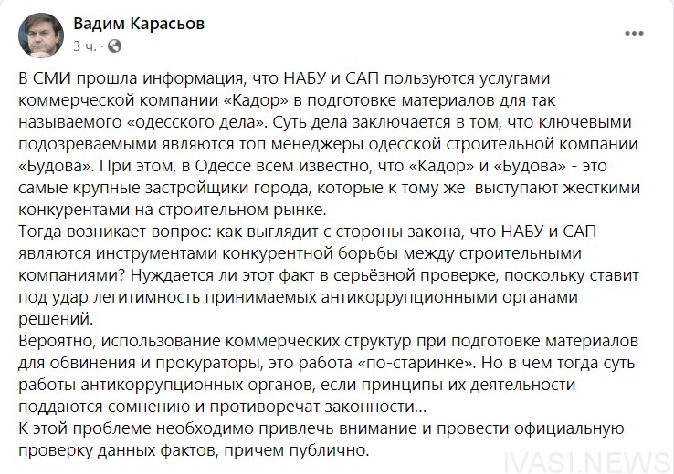 Как пишут "Иваси", об этом заявил политолог Вадим Карасев в Facebook.