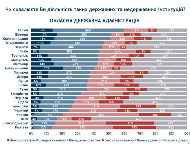 Так, наибольшей она была на востоке страны - работу главы Харьковской области Юлии Светличной поддерживали 60% жителей. Самой низкой была поддержка работы местной администрации в соседней Полтавской области - всего 14%. Недалеко от аутсайдера ушла и столица - в Киеве действия государственной власти поддерживали лишь 17% киевлян. Столица оказалась и самой нерешительной - более 60% респондентов не смогли определиться со своим отношением к местной администрации.