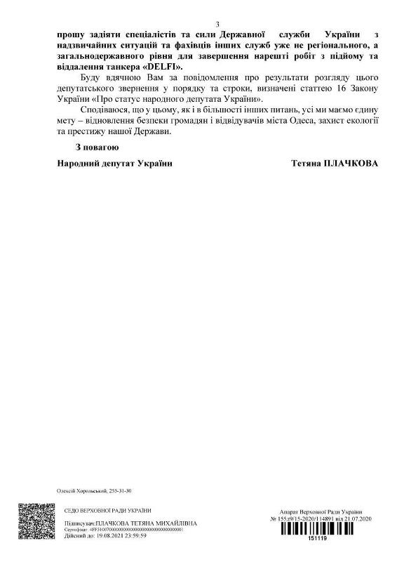 В своем обращении к Гаранту Конституции депутат акцентировала внимание на необходимости вмешаться в ситуацию с бездействием должностных лиц и задействовать специалистов и силы ГСЧС и других служб госуровня для завершения работ по удалению танкера "DELFI".