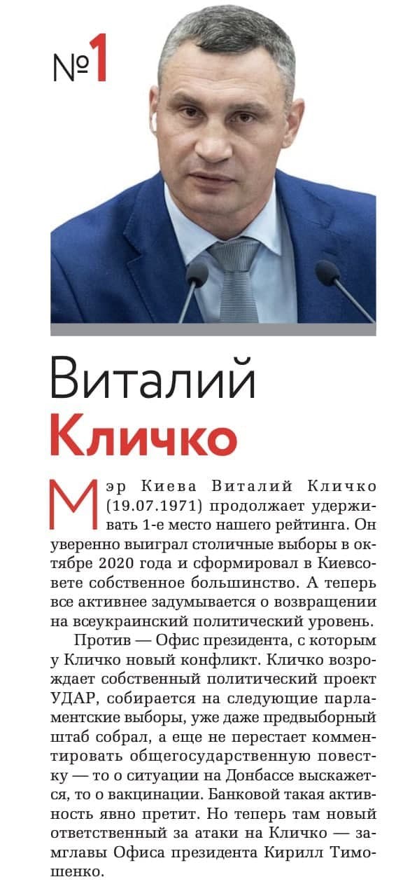 "Мэр Киева Виталий Кличко продолжает удерживать 1-е место нашего рейтинга. Он уверенно выиграл столичные выборы в октябре 2020 года и сформировал в Киевсовете собственное большинство. А теперь все активнее задумывается о возвращении на всеукраинский политический уровень", - сказано в материале.