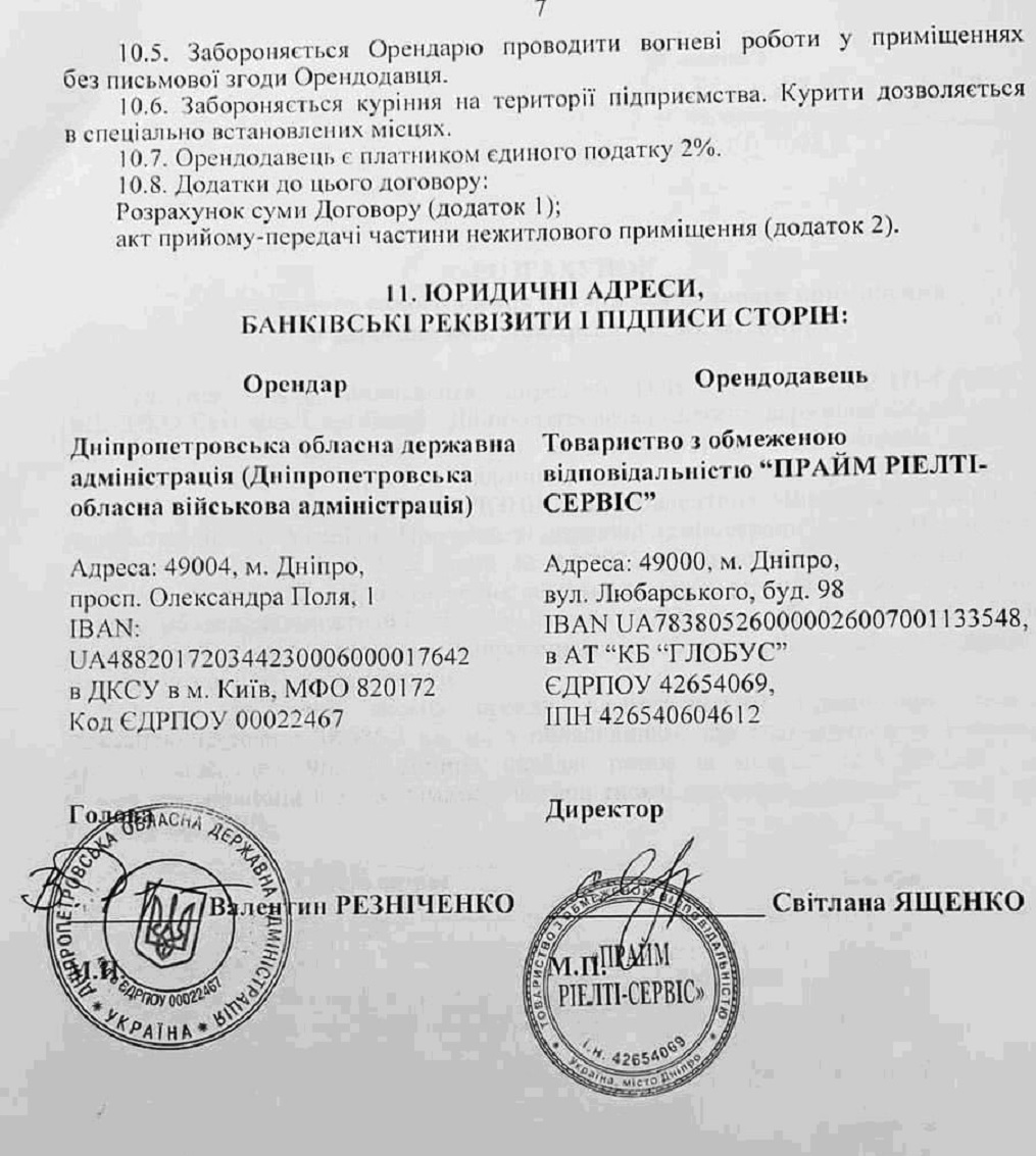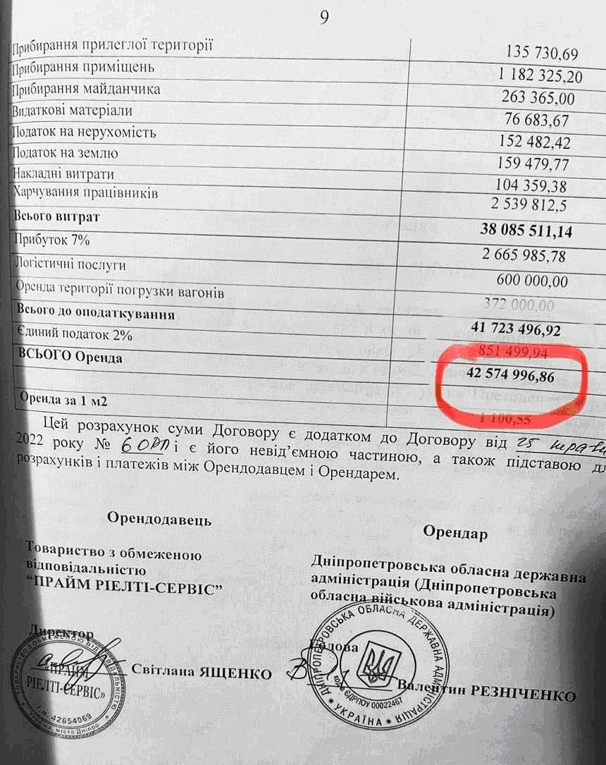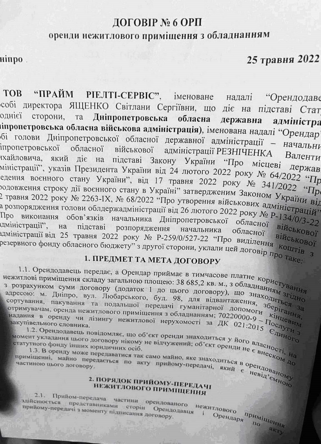 По его словам, Резниченко в мае 2022 якобы заключил с ООО "Прайм Риелти-Сервис" договор за бюджетные деньги об аренде склада площадью 38,7 тыс. м. кв. по адресу ул. Любарского, 98 за более чем 42,5 млн грн в месяц. Об этом свидетельствует договор между Резниченко и директором ООО "Прайм Риелти-Сервис" Светланой Ященко, который опубликовал журналист.