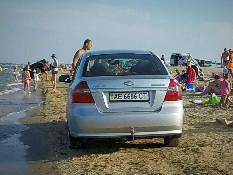 На фото изображен автомобиль с украинским государственным номером, который зарегистрирован в Днепропетровской области, припаркованный в центре пляжа у береговой линии.