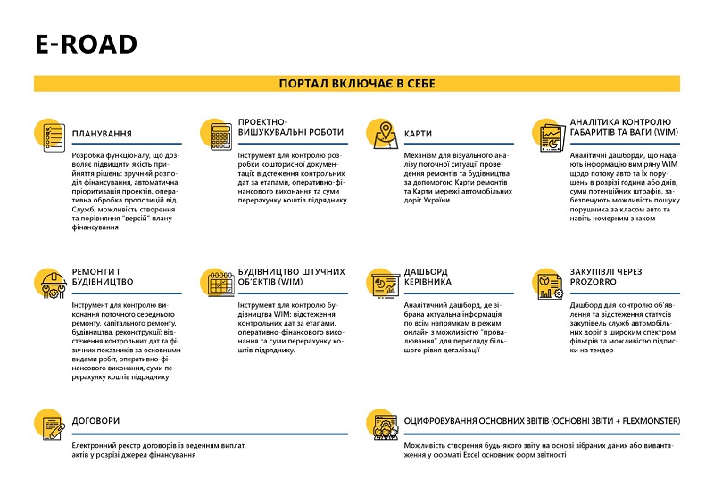 Отмечается, что E-ROAD включает электронный реестр договоров с ведением выплат, актов в разрезе источников финансирования, инструмент для контроля за строительством площадок Системы взвешивание-в-движении (WIM), а также механизм для визуального анализа текущей ситуации выполнения ремонтов и строительства с помощью Карты ремонтов и Карты сети автомобильных дорог Украины.