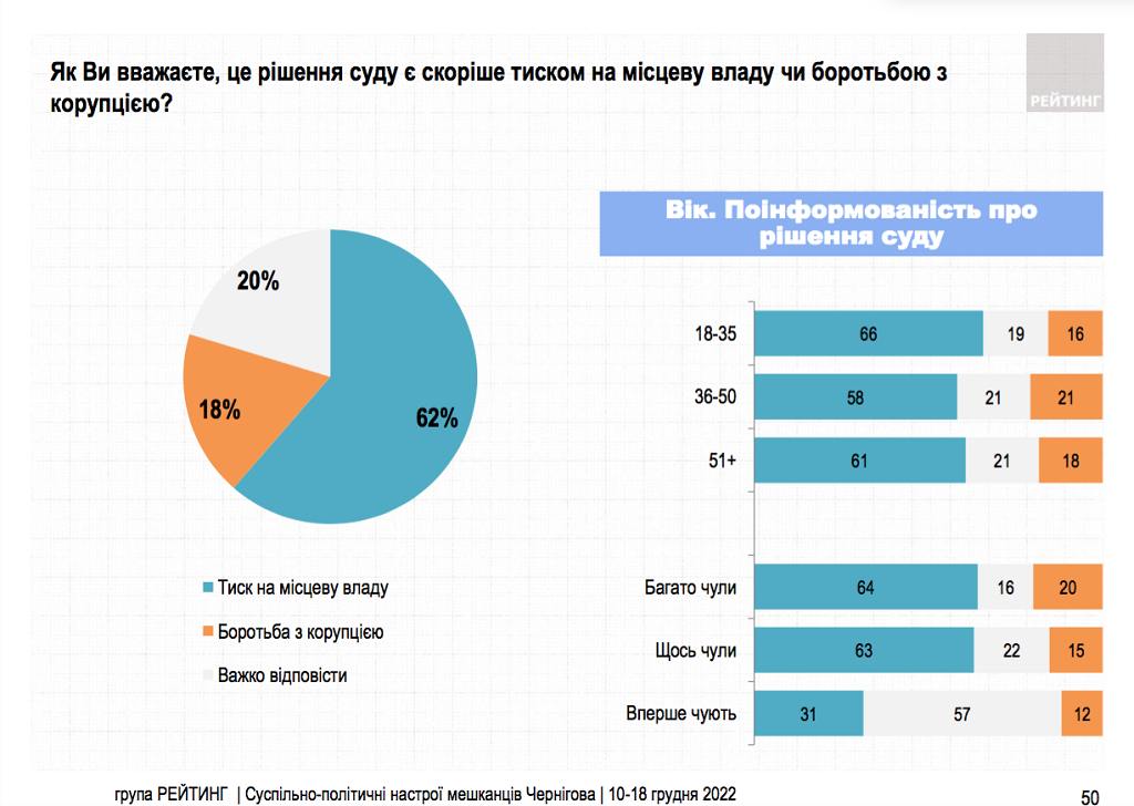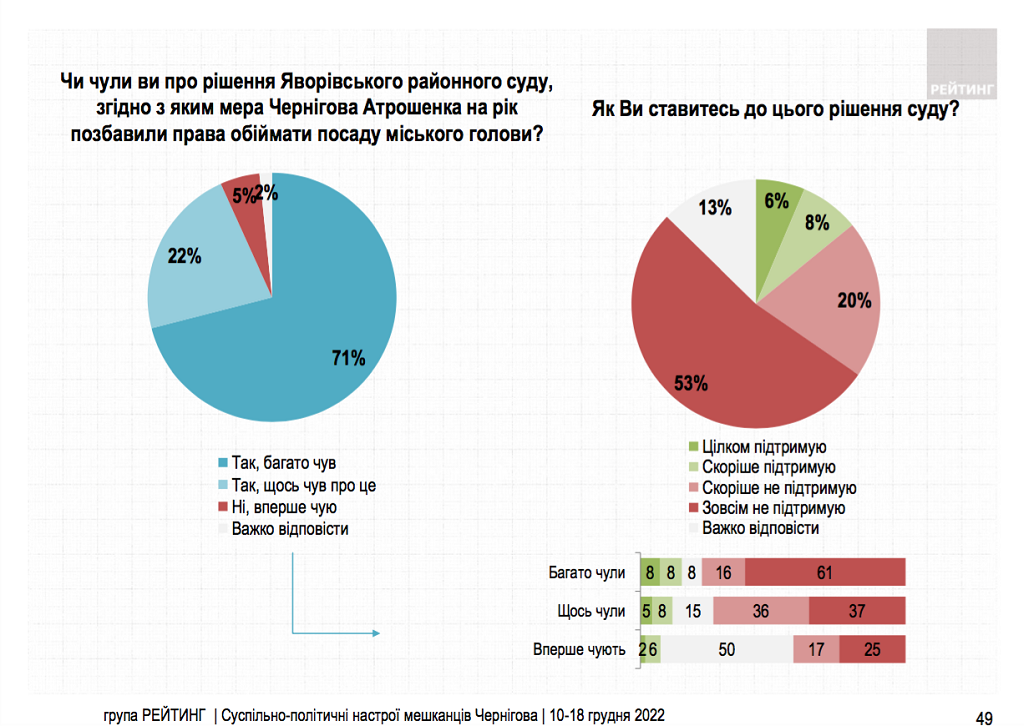"71% опрошенных хорошо знают о решении Яворовского районного суда, согласно которому мэра Чернигова Владислава Атрошенко на год лишили права занимать должность городского головы. 22% – что-то слышали об этом. 73% черниговчан не поддерживают такое судебное решение, только 14% – поддерживают. 62% убеждены, что такое решение суда является давлением на местные власти, 18% считают, что это борьба с коррупцией", - рассказывается в социологическом исследовании.