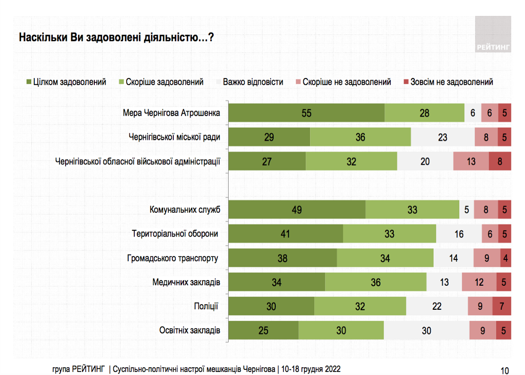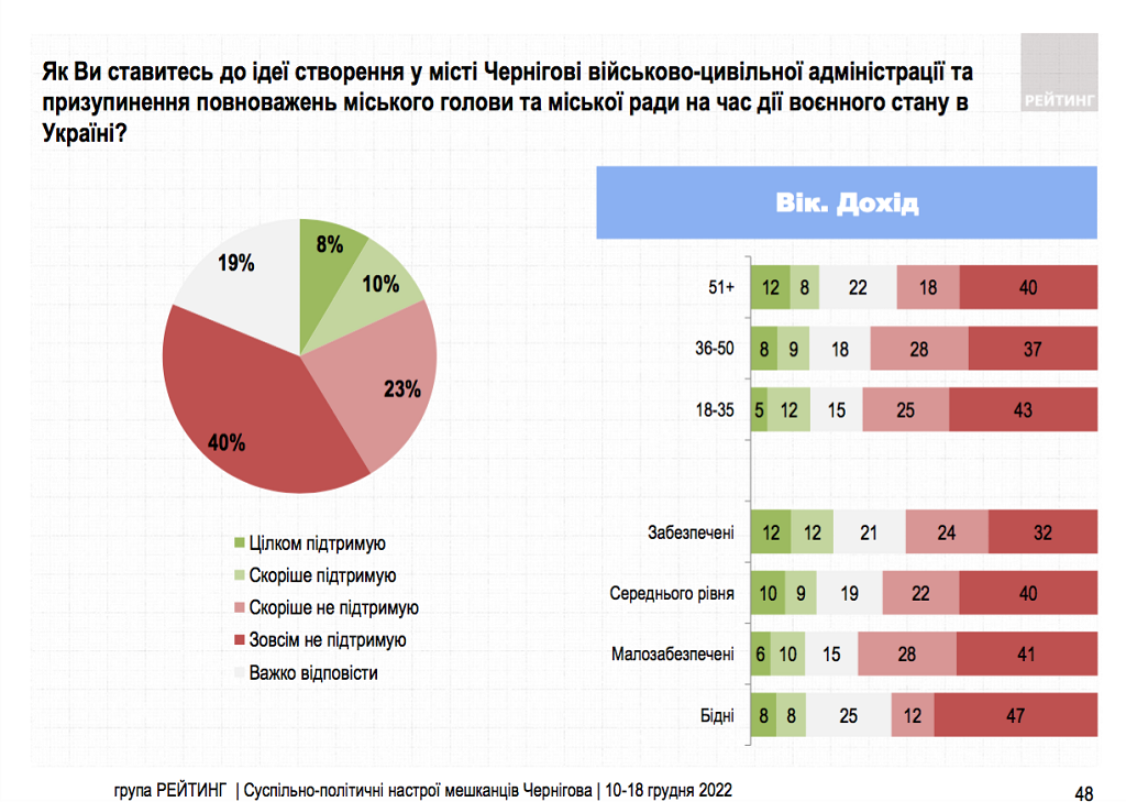 "Две трети негативно относятся к идее создания в Чернигове военно-гражданской администрации и приостановления полномочий городского головы и городского совета на время действия военного положения в Украине. Поддерживают такую инициативу – 18%", – отмечает Рейтинг.