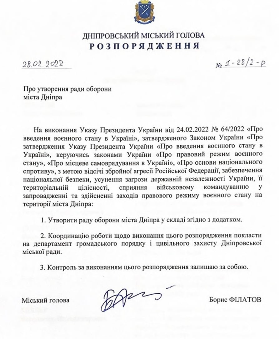 Распоряжение Днепровского городского головы от 28.02.2022 г.;