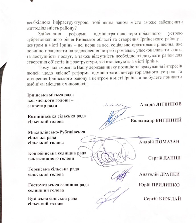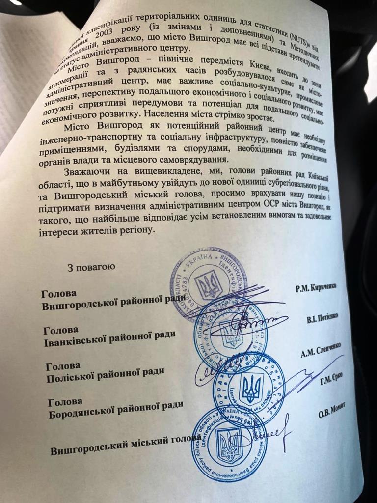 В своем письме глава Вышгородского райсовета Ростислав Кириченко, глава Иванковского райсовета Валерий Потиенко, глава Полесской райсовета Андрей Слепченко, глава Бородянского райсовета Георгий Ерко, Вышгородский городской голова Алексей Момот тоже не видят Бучу райцентром, а предлагают, чтобы центром был Вышгород.