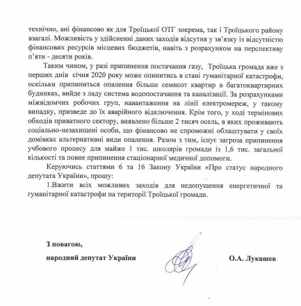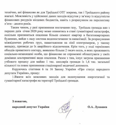 "Просим власть принять все возможные меры для недопущения энергетической и гуманитарной катастрофы на территории Троицкой громады", – резюмировал Александр Лукашев.