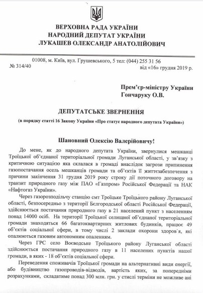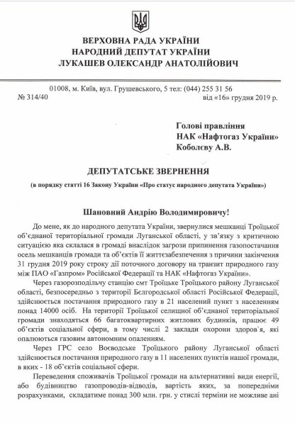 Парламентарий также обратился к премьер-министру Алексею Гончаруку и главе правления НАК "Нафтогаз" Андрею Коболеву с просьбой помочь в решении вопроса.