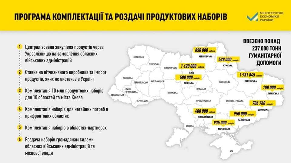 "Параллельно происходит поставка в пострадавшие от войны регионы 10 млн продуктовых наборов. Они содержат продукты длительного хранения в расчете на один месяц для одного человека", - добавила министр экономики.