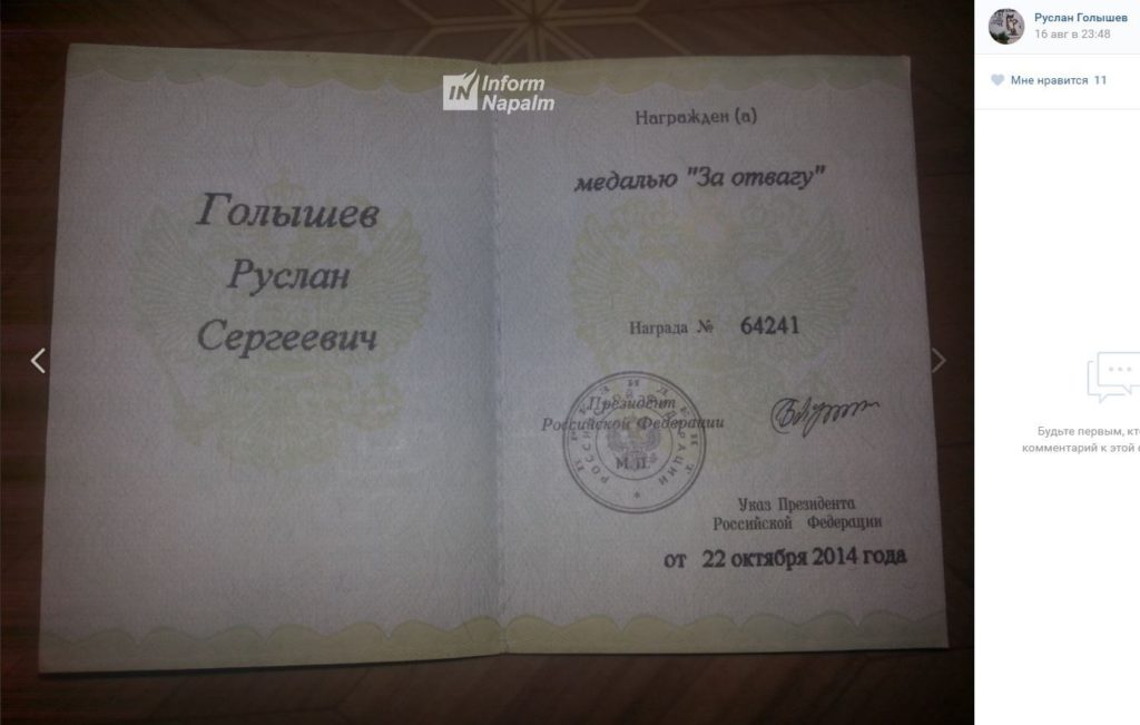 "По истечении 3 лет, Руслан Голышев опубликовал фотографию медали "За отвагу", врученную ему указом президента России от 22.10.2014 года и с соответствующим комментарием. Помимо нее, Голышев хвастает медалью за участие в российско-грузинской войне 2008 года за подписью командира в/ч 54801", - говорится в сообщении.