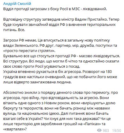 "Угрозы РФ нет. Это вписывается в общую новую политику власти Зеленского. РФ друг, партнер, мир, дружба, уступки и "просто перестать стрелять". Буквально все что касается противодействия РФ - массово ликвидируется. Все структуры. Все люди, которые могли бы четко и единодушно сказать свое слово против России устраняются с должностей", - заявил Смолий.