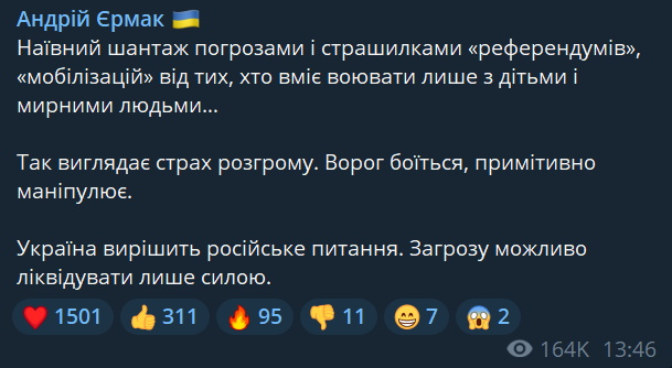 Глава Офиса Президента Андрей Ермак заявил, что враг боится разгрома и примитивно манипулирует. Он отметил, что Украина "решит российский вопрос силой".