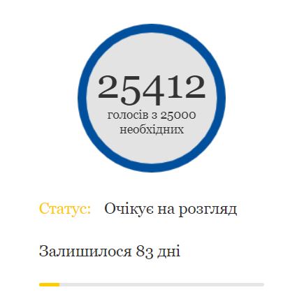 По состоянию 21:00 петицию подписали более 25 400 человек. Отметим, что подписи были собраны за рекордно короткий срок - 8 дней и несколько часов. В то же время на сайте указано, что до окончания сбора подписей остается 83 дня.
