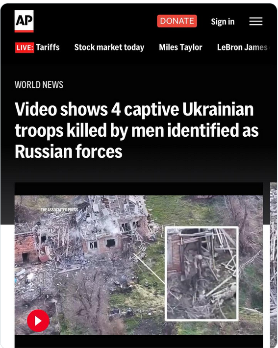 На видео из украинского беспилотника, которое Associated Press получило от европейских военных, видно, как солдаты в российской форме стреляют в спину каждому из четырех украинцев с такой яростью, что один мужчина остался без головы.