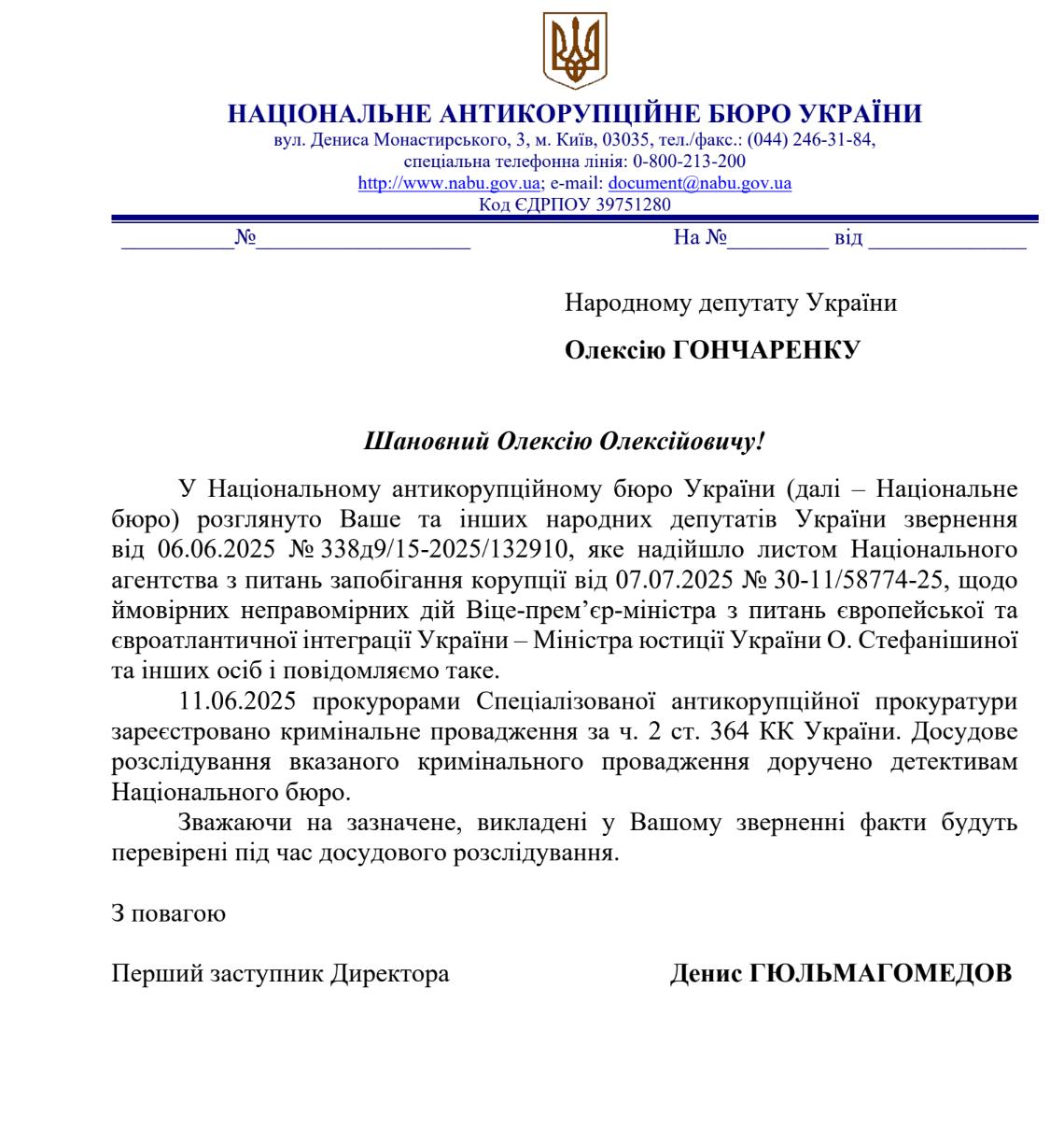 "Об этом говорится в ответе НАБУ на мое обращение. Производство было открыто 11 июня 2025 года. Досудебное расследование проводят детективы НАБУ", – написал Гончаренко.