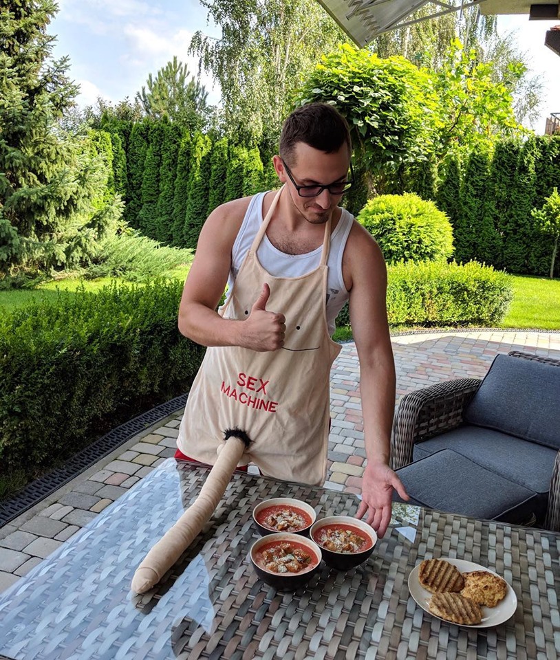 На фотографии Шефир-младший стоит у стола в фартуке, к которому пришит половой орган внушительных размеров.