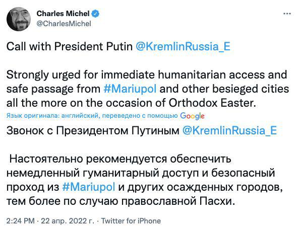 В страстную пятницу, 22 апреля, глава Евросовета Шарль Мишель позвонил президенту РФ Владимиру Путину и настоятельно рекомендовал обеспечить немедленный гуманитарный доступ и безопасный проход из Мариуполя и других осажденных городов, тем более по случаю православной Пасхи.