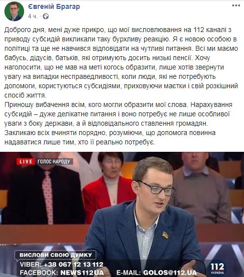 "Мне очень жаль, что мои высказывания на 112 канале по поводу субсидий вызвали такую бурную реакцию. Я новое лицо в политике и не научился отвечать на чувствительные вопросы. Все мы имеем бабушек, дедушек, родителей, которые получают достаточно низкие пенсии" , - написал Брагар.