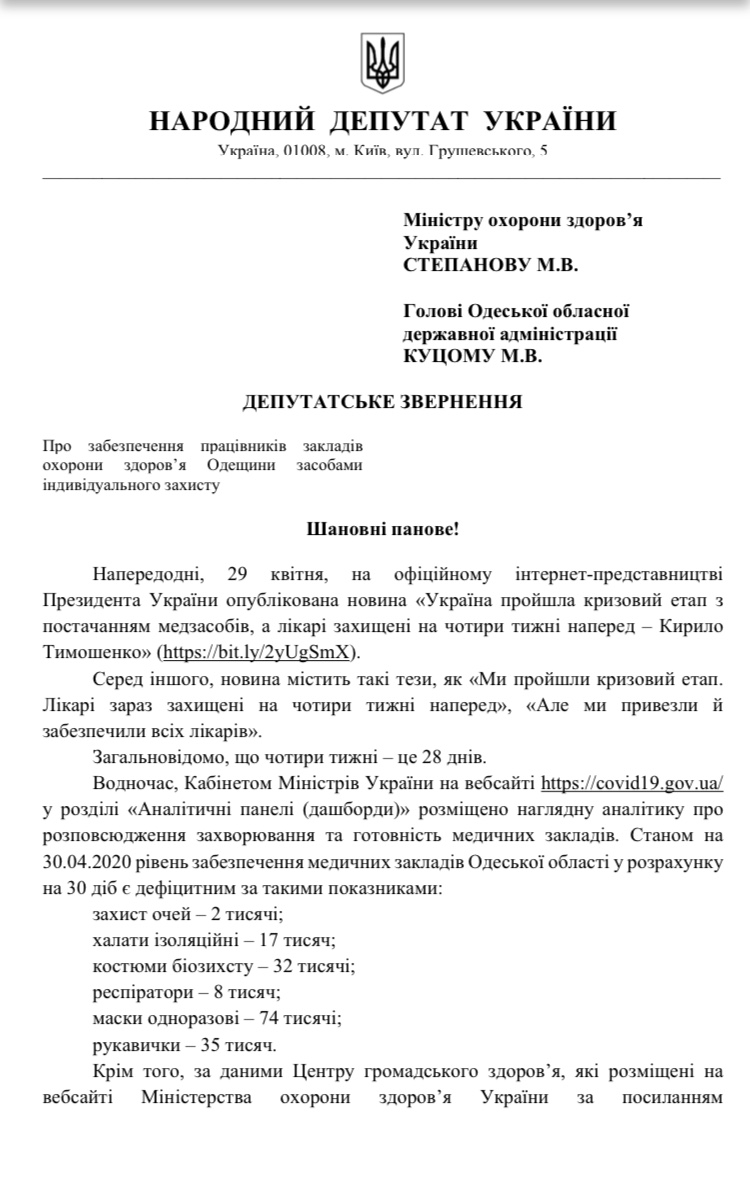 Политик обратила внимание, что о триумфальной победе над дефицитом средств индивидуальной защиты для медиков на сайте президента сообщили в то время, когда за день количество заболевших COVID 19 увеличилось на 455 человек, а с начала эпидемии 20% больных в Украине составляют медики. Речь идет о статье "Украина прошла кризисный этап с поставкой медсредств, а врачи защищены на четыре недели вперед".