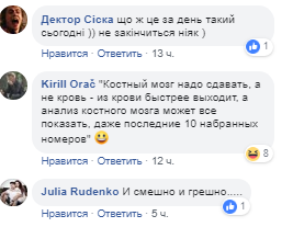 "Костный мозг надо сдавать, а не кровь - из крови быстрее выходит, а анализ костного мозга может все показать, даже последние 10 набранных номеров", "И смешно и грешно", "что же это за день такой сегодня)) не закончится никак)", - пишут комментаторы.