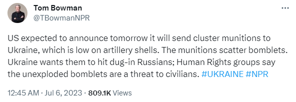 В то же время репортер Том Бауман, освещающий деятельность Пентагона, сообщил, что США объявят об отправке кассетных боеприпасов в Украину уже сегодня.