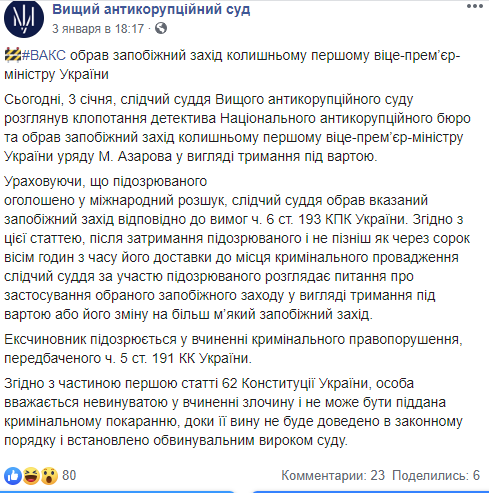 "Сегодня, 3 января, следственный судья Высшего антикоррупционного суда рассмотрел ходатайство детектива Национального антикоррупционного бюро и избрал меру пресечения бывшему первому вице-премьер-министру Украины правительства Николая Азарова в виде содержания под стражей. Учитывая, что подозреваемый объявлен в международный розыск, следственный судья избрал меру пресечения в соответствии с требованиями ч.6 ст. 193 УПК Украины", - говорится в сообщении.