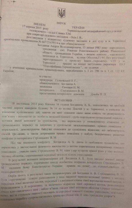 "Богданец объясняет свою судимость случайностью, связанной с конфликтом на дороге "из-за того что я воевал". Почитайте приговор. Для разнообразия", - говорится в подписи.