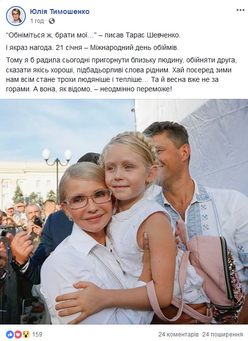 Лидер "Батькивщины" Юлия Тимошенко растрогала сеть, опубликовав фото к Международному дню объятий.