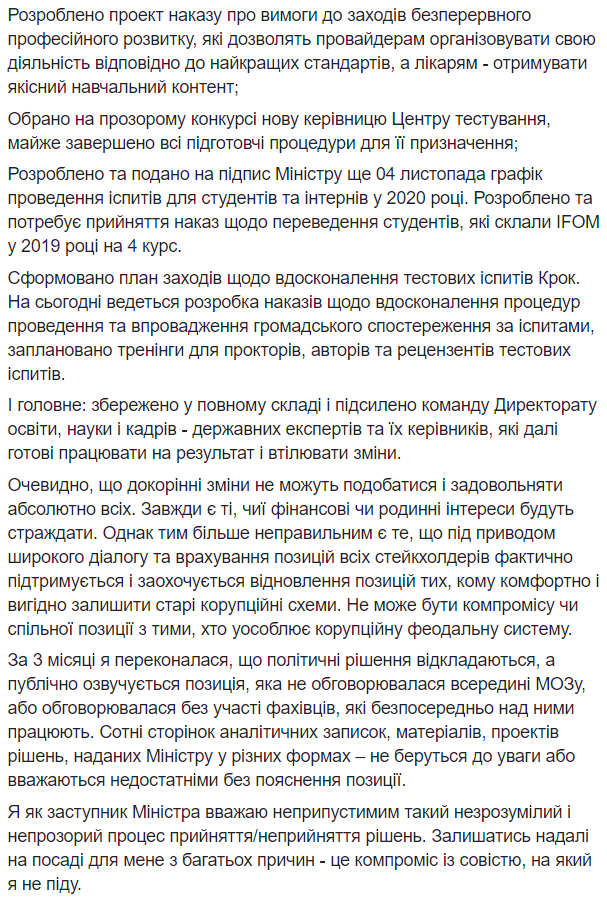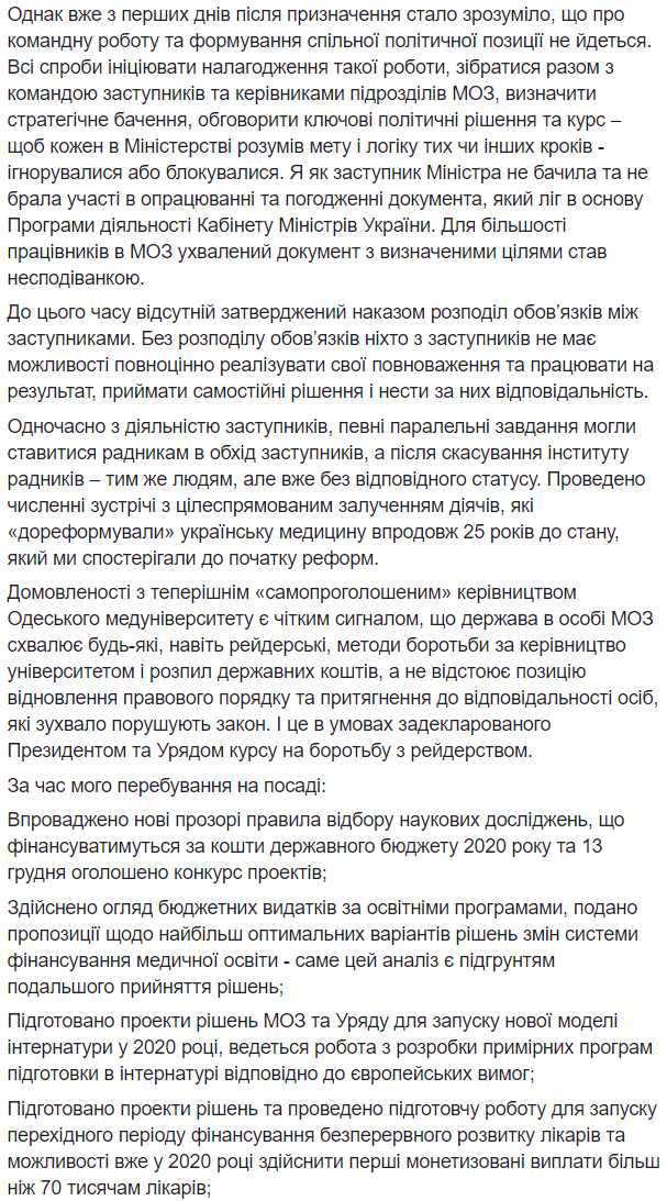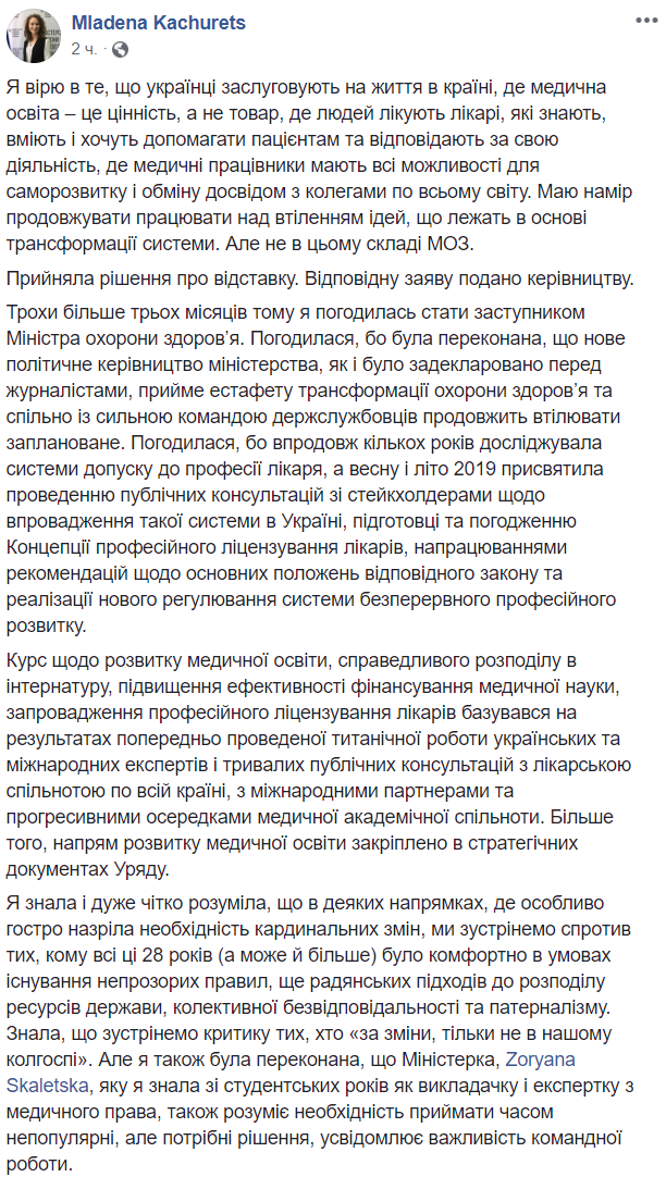 Качурец уточнила, что планирует в дальнейшем работать над "воплощением идей, лежащих в основе трансформации системы", но не с этим составом Минздрава.