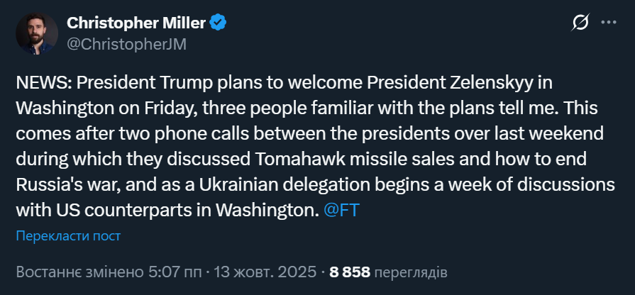 "Это произошло после двух телефонных разговоров между президентами в минувшие выходные, во время которых они обсуждали продажу ракет Tomahawk и пути прекращения войны с Россией, а также как украинская делегация начинает неделю переговоров с американскими коллегами в Вашингтоне", - написал Миллер.