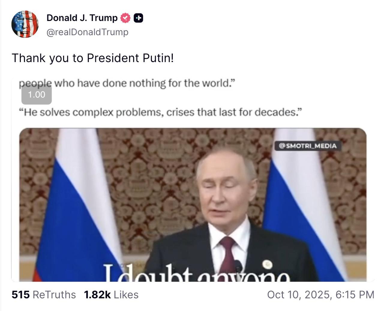 Президент Соединенных Штатов Дональд Трамп поблагодарил диктатора РФ Владимира Путина, который одобрительно отозвался о миротворческих усилиях американского лидера.