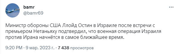 Министр обороны США Ллойд Остин в Израиле после встречи с премьером Нетаньяху заявил, что США не разрешат Ирану иметь ядерное оружие, отметив, что Россия пошла на беспрецедентное военное сотрудничество с Ираном, в том числе по ракетам, средствам противовоздушной обороны, что включает в себя применение иранских беспилотников на территории Украины.