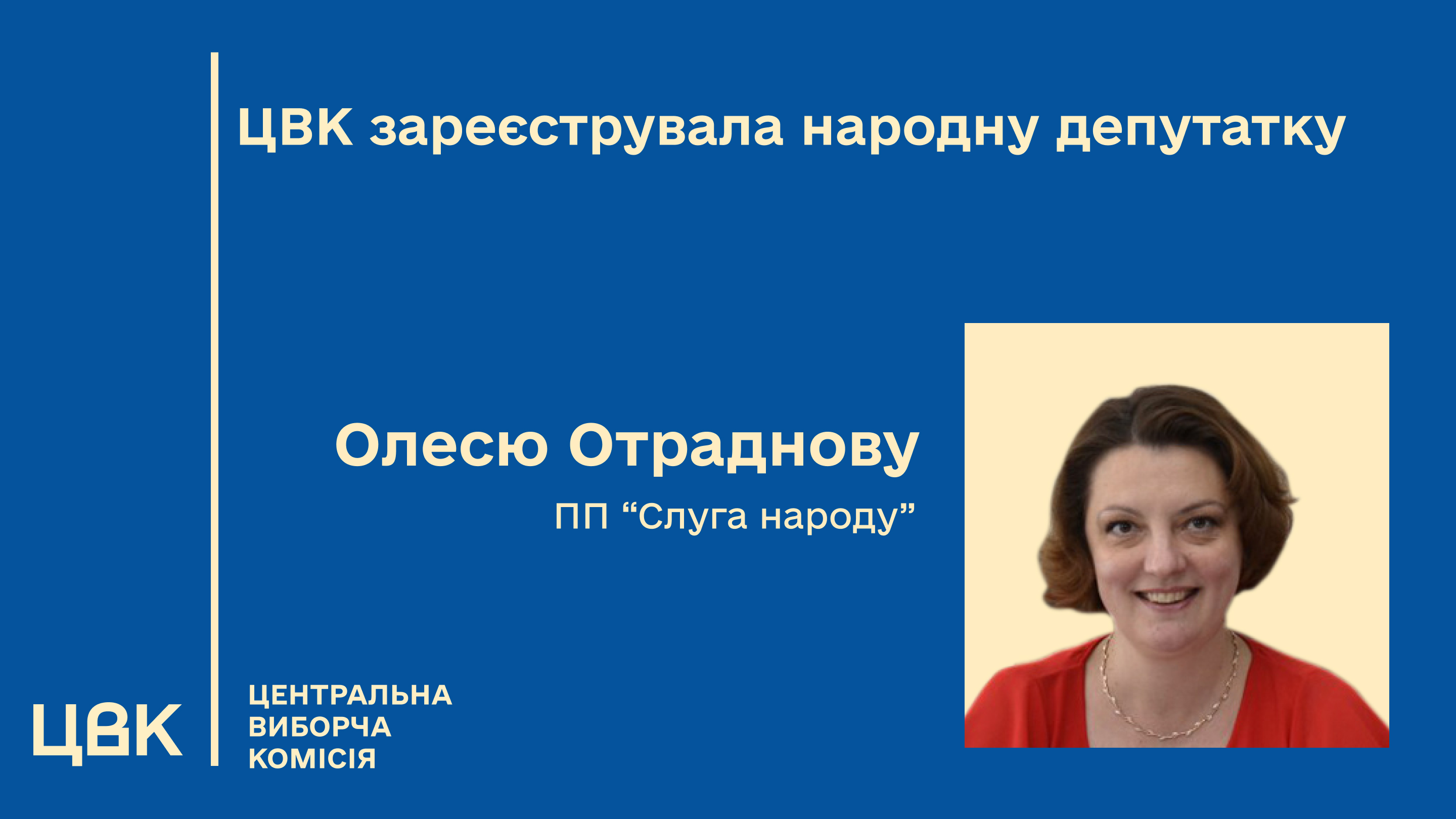 18 февраля Центральная избирательная комиссия (ЦИК) зарегистрировала нового народного депутата Украины — Олесю Отраднову.