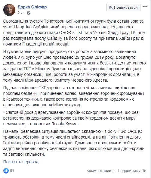 Об этом сообщила пресс-секретарь представителя Украины в ТКГ Леонида Кучмы Дарка Олифер.