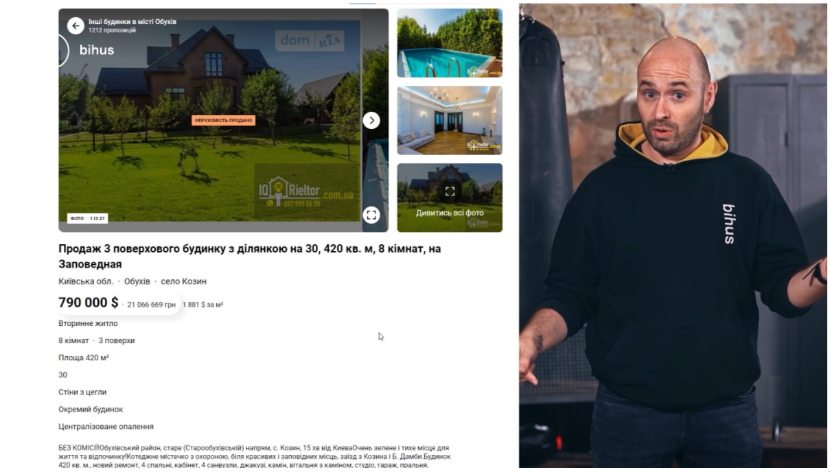 Сопоставив то, что уже попало в кадр с объявлениями о продаже и аренде недвижимости, журналисты установили, что речь идет о трехэтажном доме в Козине возле Киева. Отмечается, что в марте прошлого года его выставили на продажу, оценив при этом в 21 миллион гривен. Также предлагалась долгосрочная аренда дома за 120 тысяч гривен в месяц.