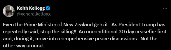 "Даже премьер Новой Зеландии понимает это. Как неоднократно говорил президент Трамп, убийства должны остановиться! Сначала безусловное 30-дневное прекращение огня, и, во время того, начало комплексных переговоров о мире. Другого пути нет".