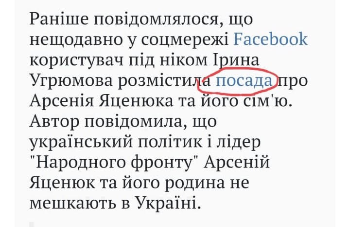 "Стоит обратить внимание на то, что "уши Москвы" буквально торчат на сайтах, которые "вентилятором" раскинули лживые публикации в интернете. Достаточно обратить внимание на текст на одном из "интернет-бачков", где ясно и очевидно, что слово пост переведено с русского как "должность", хотя речь шла о посте в ФБ (см. скриншот). Показательно, что отрабатывая годами деньги ФСБ, провокаторы даже не научились делать грамотные переводы, чем выдают своих хозяев и заказчиков", - говорится в заявлении.