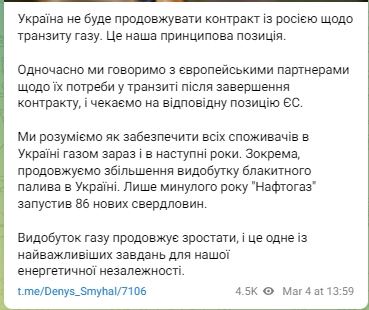 "Одновременно мы говорим с европейскими партнерами по поводу их потребности в транзите после завершения контракта, и ждем соответствующей позиции ЕС", - написал Шмыгаль.