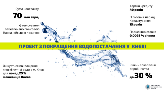 Также был согласован проект по строительству эффективной системы водоснабжения в Киеве. Около 25% местных жителей ожидает улучшение качества воды. Стоимость соглашения - 70 миллионов евро. евро.