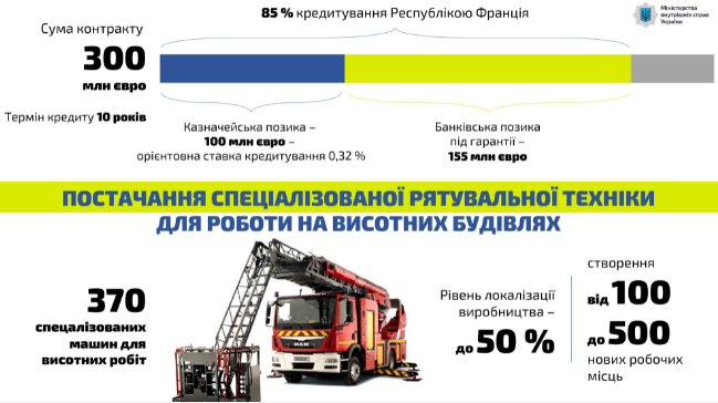 Также подписано соглашение про усиление защиты населения Украины от чрезвычайных ситуаций, а именно совместное производство 370 единиц пожарных машины подъемников для работы спасателей на высоте. Стоимость реализации соглашения составит 300 миллионов евро.