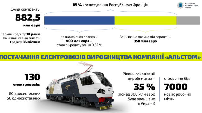 В частности, предусматривается обновление парка грузовых электрических локомотивов АО "Укрзализныця". В Украину планируется поставка 130 электровозов компании Alstom 80 двухсистемных, 50 - односистемних машин. Стоимость проекта - 882,5 миллиона евро. Это предусматривает создание 7000 новых рабочих мест.