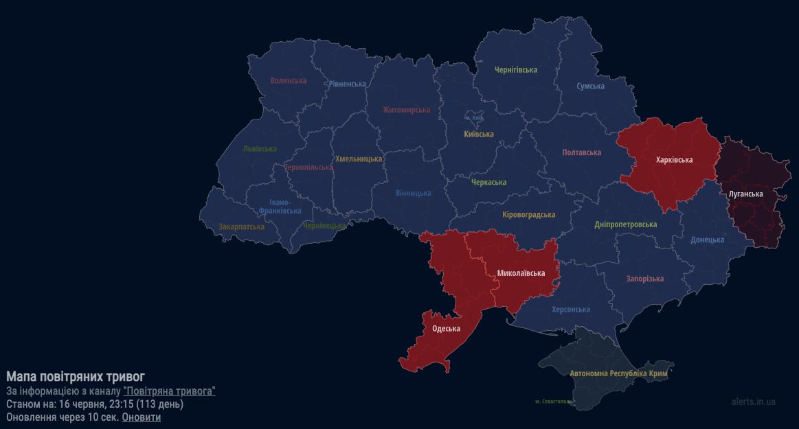 23:15 Сообщают о взрывах в Харькове и Одессе. На графике - карта воздушных тревог.