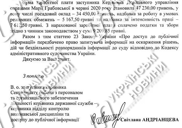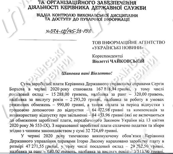 "Сумма заработной платы руководителя Государственного управления делами Сергея Борзова в июне 2020 года составила 167 819 гривен", - сказано в нем.