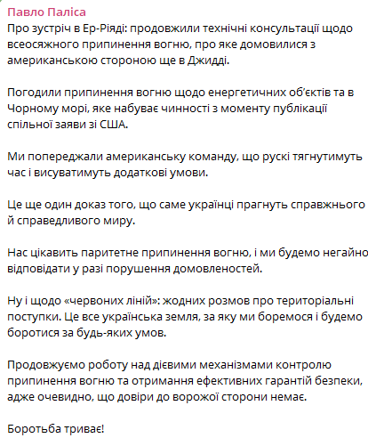 "Это все украинская земля, за которую мы боремся и будем бороться в любых условиях. Продолжаем работу над действенными механизмами контроля прекращения огня и получения эффективных гарантий безопасности, ведь очевидно, что доверия к вражеской стороне нет", - добавил Палиса.