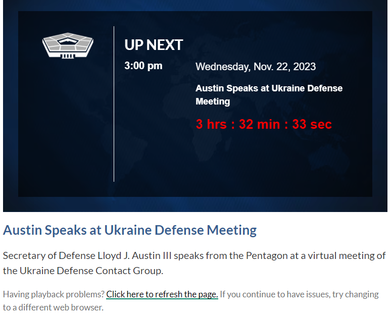 Объявление появилось на сайте Пентагона, там запущен обратный отсчет до начала встречи, которую традиционно открывает министр обороны США Ллойд Остин. Его выступление будет транслироваться на официальном сайте Пентагона.