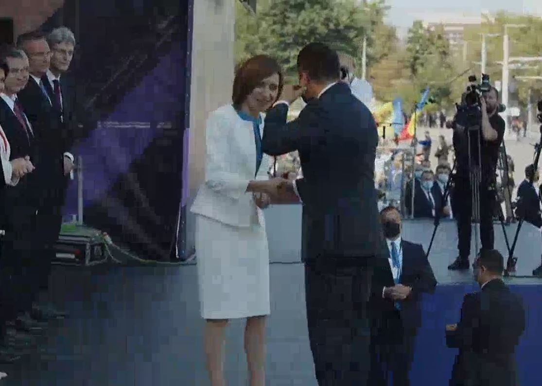 Глава украинского государства появился на параде буквально за минуту до окончания торжественного прохождения "коробочек" молдавских военных, спасателей и почетной стражи. Он быстрым шагом проследовал на трибуну, поприветствовал Майю Санду и занял свое место в ряду других глав государств.
