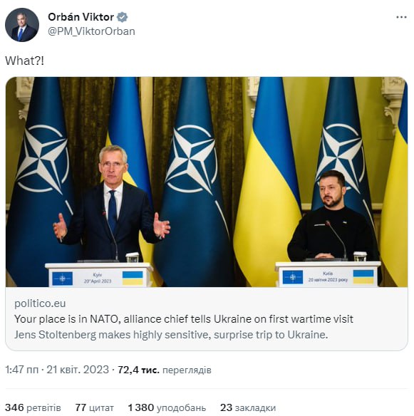 14:50 Премьер-министр Венгрии Виктор Орбан возмутился словам генсека НАТО Йенса Столтенберга о месте Украины в НАТО.