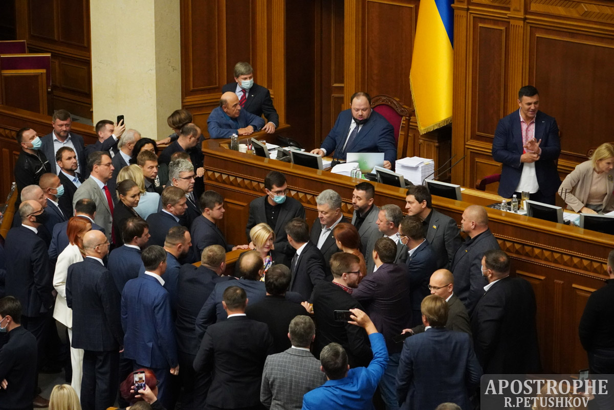 После этого оппозиционные силы заблокировали трибуну. Они обвинили председательствующего на заседании Руслана Стефанчука в нарушении регламента.