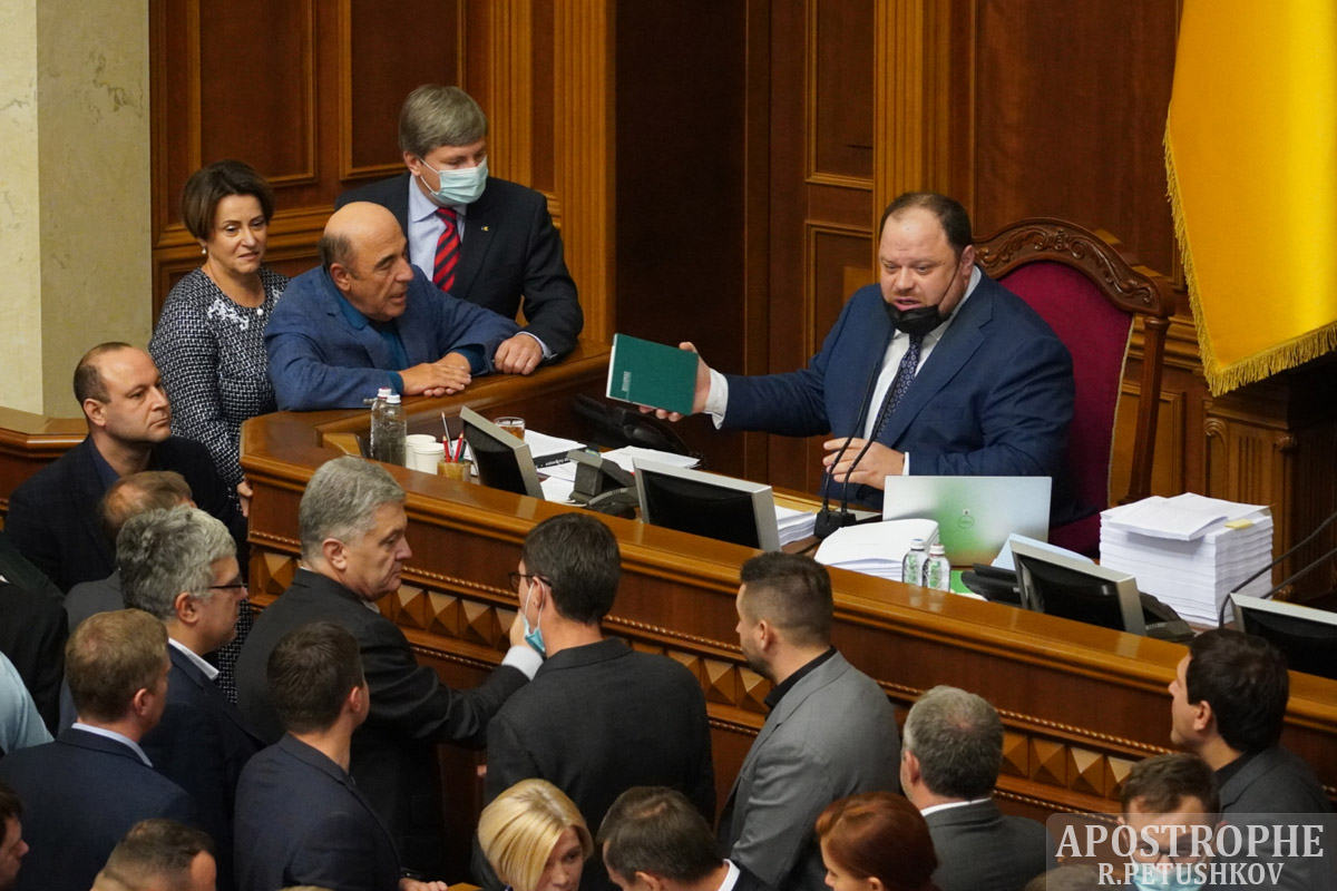 После решения о постатейном рассмотрении закона Евросолидарность и Голос потребовали отстранить первого вице-спикера Руслана Стефанчука (временно заменяет спикера Дмитрия Разумкова, который на больничном - ред.) от ведения заседания.